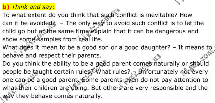 Think and say: To what extent do you think that such conflict is inevitable? How can it be avoided? – The only way to avoid such conflict is to let the child go but at the same time explain that it can be dangerous and show some samples from real life. What does it mean to be a good son or a good daughter? – It means to behave and respect their parents. Do you think the ability to be a good parent comes naturally or should people be taught certain rules? What rules? – Unfortunately not every one can be a good parent. Some parents even do not pay attention to what their children are doing. But others are very responsible and the way they behave comes naturally.