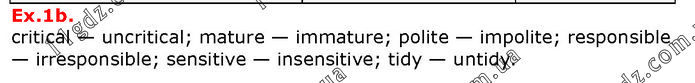 critical — uncritical; mature — immature; polite — impolite; responsible — irresponsible; sensitive — insensitive; tidy — untidy.