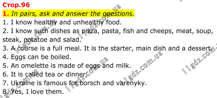 In pairs, ask and answer the questions. 1. I know healthy and unhealthy food. 2. I know such dishes as pizza, pasta, fish and cheeps, meat, soup, steak, potatoe and salad. 3. A course is a full meal. It is the starter, main dish and a dessert. 4. Eggs can be boiled. 5. An omelette is made of eggs and milk. 6. It is called tea or dinner. 7. Ukraine is famous for borsch and varenyky. 8. Yes, I love them.