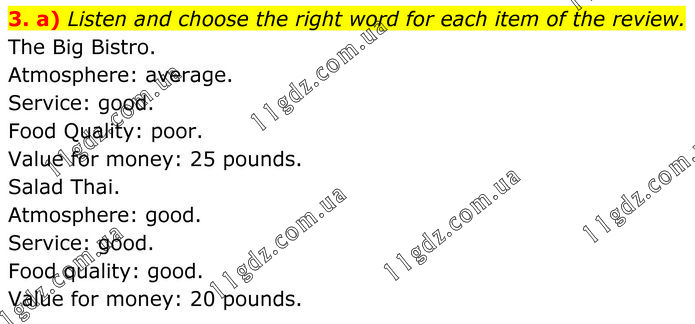 Listen and choose the right word for each item of the review. The Big Bistro. Atmosphere: average. Service: good. Food Quality: poor. Value for money: 25 pounds. Salad Thai. Atmosphere: good. Service: good. Food quality: good. Value for money: 20 pounds.