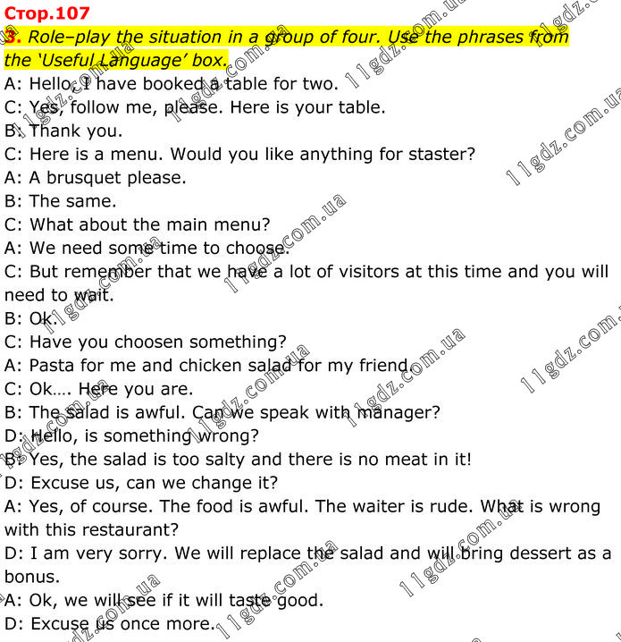 Role–play the situation in a group of four. Use the phrases from the ‘Useful Language’ box. A: Hello, I have booked a table for two. C: Yes, follow me, please. Here is your table. B: Thank you. C: Here is a menu. Would you like anything for staster? A: A brusquet please. B: The same. C: What about the main menu? A: We need some time to choose. C: But remember that we have a lot of visitors at this time and you will need to wait. B: Ok. C: Have you choosen something? A: Pasta for me and chicken salad for my friend. C: Ok…. Here you are. B: The salad is awful. Can we speak with manager? D: Hello, is something wrong? B: Yes, the salad is too salty and there is no meat in it! D: Excuse us, can we change it? A: Yes, of course. The food is awful. The waiter is rude. What is wrong with this restaurant? D: I am very sorry. We will replace the salad and will bring dessert as a bonus. A: Ok, we will see if it will taste good. D: Excuse us once more.