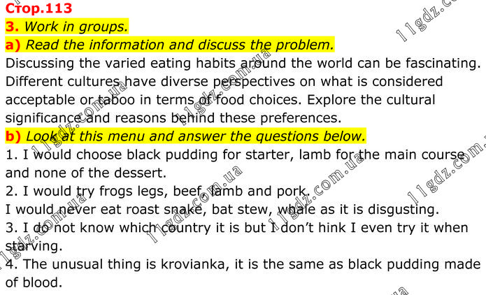 Work in groups. a) Read the information and discuss the problem. Discussing the varied eating habits around the world can be fascinating. Different cultures have diverse perspectives on what is considered acceptable or taboo in terms of food choices. Explore the cultural significance and reasons behind these preferences. b) Look at this menu and answer the questions below. 1. I would choose black pudding for starter, lamb for the main course and none of the dessert. 2. I would try frogs legs, beef, lamb and pork. I would never eat roast snake, bat stew, whale as it is disgusting. 3. I do not know which country it is but I don’t hink I even try it when starving. 4. The unusual thing is krovianka, it is the same as black pudding made of blood.