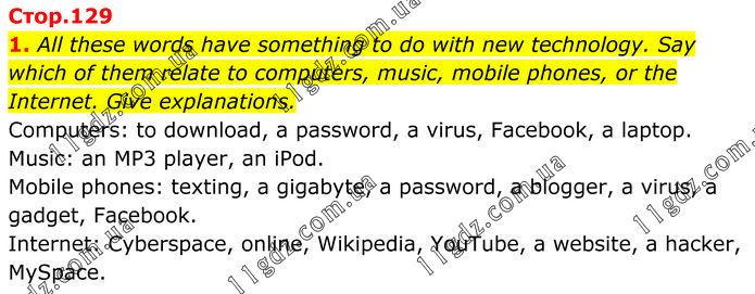 All these words have something to do with new technology. Say which of them relate to computers, music, mobile phones, or the Internet. Give explanations. Computers: to download, a password, a virus, Facebook, a laptop. Music: an MP3 player, an iPod. Mobile phones: texting, a gigabyte, a password, a blogger, a virus, a gadget, Facebook. Internet: Cyberspace, online, Wikipedia, YouTube, a website, a hacker, MySpace.