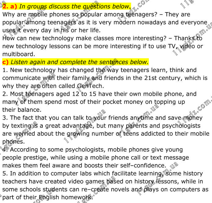 a) In groups discuss the questions below. Why are mobile phones so popular among teenagers? – They are popular among teenagers as it is very modern nowadays and everyone uses it every day in his or her life. How can new technology make classes more interesting? – Thanks to new technology lessons can be more interesting if to use TV, video or multiboard. c) Listen again and complete the sentences below. 1. New technology has changed the way teenagers learn, think and communicate with their family and friends in the 21st century, which is why they are often called GenTech. 2. Most teenagers aged 12 to 15 have their own mobile phone, and many of them spend most of their pocket money on topping up their balance. 3. The fact that you can talk to your friends anytime and save money by texting is a great advantage, but many parents and psychologists are worried about the growing number of teens addicted to their mobile phones. 4. According to some psychologists, mobile phones give young people prestige, while using a mobile phone call or text message makes them feel aware and boosts their self–confidence. 5. In addition to computer labs which facilitate learning, some history teachers have created video games based on history lessons, while in some schools students can re–create novels and plays on computers as part of their English homework.