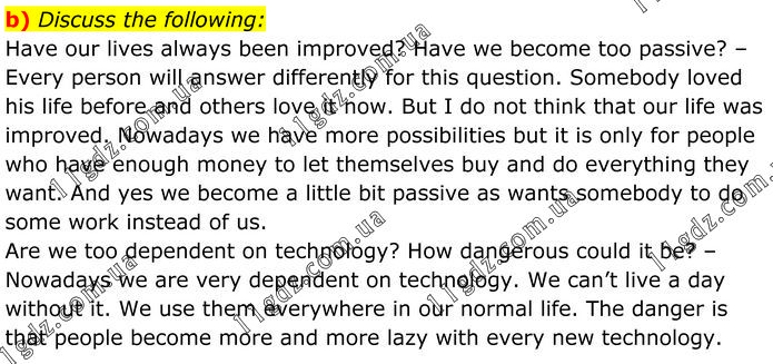 Discuss the following: Have our lives always been improved? Have we become too passive? – Every person will answer differently for this question. Somebody loved his life before and others love it now. But I do not think that our life was improved. Nowadays we have more possibilities but it is only for people who have enough money to let themselves buy and do everything they want. And yes we become a little bit passive as wants somebody to do some work instead of us. Are we too dependent on technology? How dangerous could it be? – Nowadays we are very dependent on technology. We can’t live a day without it. We use them everywhere in our normal life. The danger is that people become more and more lazy with every new technology.