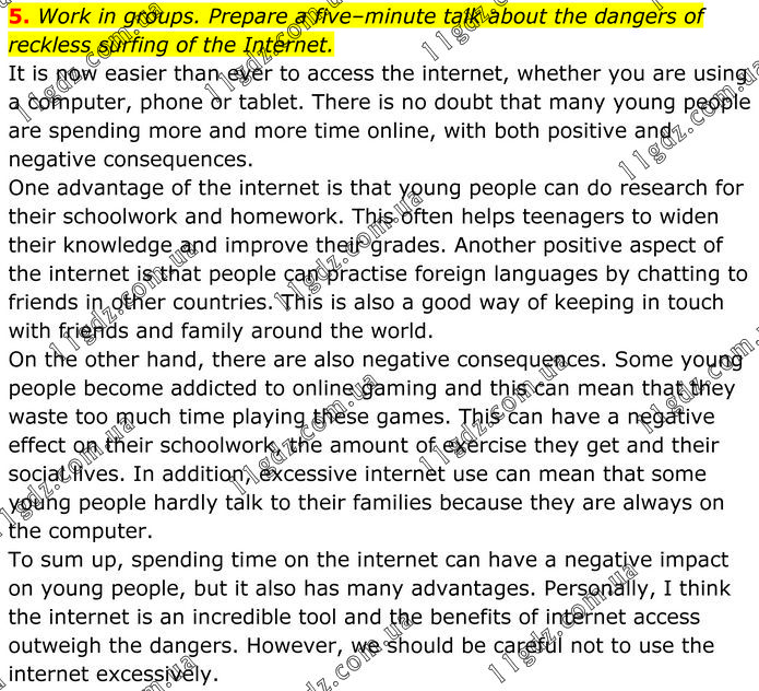 Work in groups. Prepare a five–minute talk about the dangers of reckless surfing of the Internet. It is now easier than ever to access the internet, whether you are using a computer, phone or tablet. There is no doubt that many young people are spending more and more time online, with both positive and negative consequences. One advantage of the internet is that young people can do research for their schoolwork and homework. This often helps teenagers to widen their knowledge and improve their grades. Another positive aspect of the internet is that people can practise foreign languages by chatting to friends in other countries. This is also a good way of keeping in touch with friends and family around the world. On the other hand, there are also negative consequences. Some young people become addicted to online gaming and this can mean that they waste too much time playing these games. This can have a negative effect on their schoolwork, the amount of exercise they get and their social lives. In addition, excessive internet use can mean that some young people hardly talk to their families because they are always on the computer. To sum up, spending time on the internet can have a negative impact on young people, but it also has many advantages. Personally, I think the internet is an incredible tool and the benefits of internet access outweigh the dangers. However, we should be careful not to use the internet excessively.