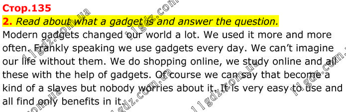 Read about what a gadget is and answer the question. Modern gadgets changed our world a lot. We used it more and more often. Frankly speaking we use gadgets every day. We can’t imagine our life without them. We do shopping online, we study online and all these with the help of gadgets. Of course we can say that become a kind of a slaves but nobody worries about it. It is very easy to use and all find only benefits in it.