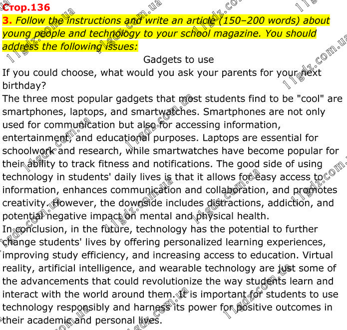 Follow the instructions and write an article (150–200 words) about young people and technology to your school magazine. You should address the following issues: Gadgets to use If you could choose, what would you ask your parents for your next birthday? The three most popular gadgets that most students find to be "cool" are smartphones, laptops, and smartwatches. Smartphones are not only used for communication but also for accessing information, entertainment, and educational purposes. Laptops are essential for schoolwork and research, while smartwatches have become popular for their ability to track fitness and notifications. The good side of using technology in students' daily lives is that it allows for easy access to information, enhances communication and collaboration, and promotes creativity. However, the downside includes distractions, addiction, and potential negative impact on mental and physical health. In conclusion, in the future, technology has the potential to further change students' lives by offering personalized learning experiences, improving study efficiency, and increasing access to education. Virtual reality, artificial intelligence, and wearable technology are just some of the advancements that could revolutionize the way students learn and interact with the world around them. It is important for students to use technology responsibly and harness its power for positive outcomes in their academic and personal lives.
