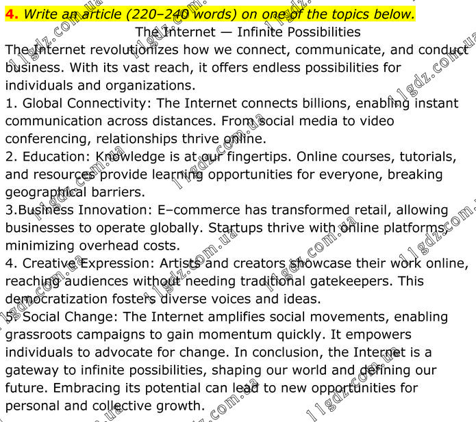 Write an article (220–240 words) on one of the topics below. The Internet — Infinite Possibilities The Internet revolutionizes how we connect, communicate, and conduct business. With its vast reach, it offers endless possibilities for individuals and organizations. 1. Global Connectivity: The Internet connects billions, enabling instant communication across distances. From social media to video conferencing, relationships thrive online. 2. Education: Knowledge is at our fingertips. Online courses, tutorials, and resources provide learning opportunities for everyone, breaking geographical barriers. 3.Business Innovation: E–commerce has transformed retail, allowing businesses to operate globally. Startups thrive with online platforms, minimizing overhead costs. 4. Creative Expression: Artists and creators showcase their work online, reaching audiences without needing traditional gatekeepers. This democratization fosters diverse voices and ideas. 5. Social Change: The Internet amplifies social movements, enabling grassroots campaigns to gain momentum quickly. It empowers individuals to advocate for change. In conclusion, the Internet is a gateway to infinite possibilities, shaping our world and defining our future. Embracing its potential can lead to new opportunities for personal and collective growth.