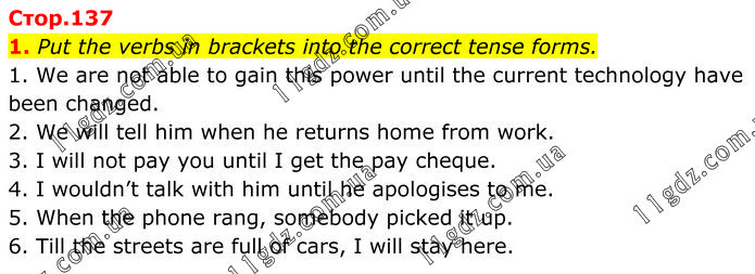 Put the verbs in brackets into the correct tense forms. 1. We are not able to gain this power until the current technology have been changed. 2. We will tell him when he returns home from work. 3. I will not pay you until I get the pay cheque. 4. I wouldn’t talk with him until he apologises to me. 5. When the phone rang, somebody picked it up. 6. Till the streets are full of cars, I will stay here.