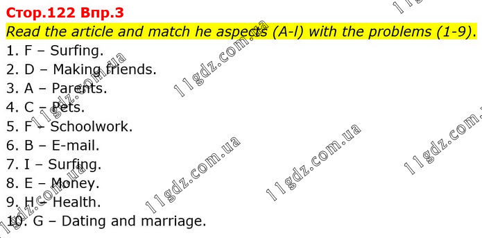 Read the article and match he aspects (A-l) with the problems (1-9). 1. F – Surfing. 2. D – Making friends. 3. A – Parents. 4. C – Pets. 5. F – Schoolwork. 6. B – E-mail. 7. I – Surfing. 8. E – Money. 9. H – Health. 10. G – Dating and marriage.