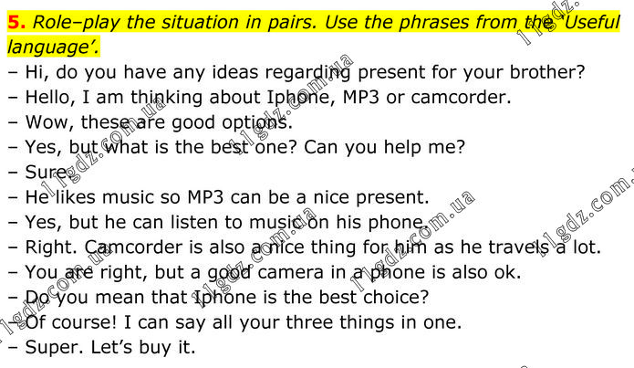 Role–play the situation in pairs. Use the phrases from the ‘Useful language’. – Hi, do you have any ideas regarding present for your brother? – Hello, I am thinking about Iphone, MP3 or camcorder. – Wow, these are good options. – Yes, but what is the best one? Can you help me? – Sure. – He likes music so MP3 can be a nice present. – Yes, but he can listen to music on his phone. – Right. Camcorder is also a nice thing for him as he travels a lot. – You are right, but a good camera in a phone is also ok. – Do you mean that Iphone is the best choice? – Of course! I can say all your three things in one. – Super. Let’s buy it.