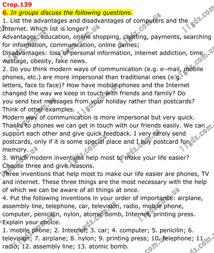 In groups discuss the following questions. 1. List the advantages and disadvantages of computers and the Internet. Which list is longer? Advantages: education, online shopping, chatting, payments, searching for information, communication, online games; Disadvantages: loss of personal information, internet addiction, time wastage, obesity, fake news. 2. Do you think modern ways of communication (e.g. e–mail, mobile phones, etc.) are more impersonal than traditional ones (e.g. letters, face to face)? How have mobile phones and the Internet changed the way we keep in touch with friends and family? Do you send text messages from your holiday rather than postcards? Think of other examples. Modern way of communication is more impersonal but very quick. Thanks to phones we can get in touch with our friends easily. We can support each other and give quick feedback. I very rarely send postcards, only if it is some special place and I buy postcard for memory. 3. Which modern inventions help most to make your life easier? Choose three and give reasons. Three inventions that help most to make our life easier are phones, TV and internet. These three things are the most necessary with the help of which we can be aware of all things at once. 4. Put the following inventions in your order of importance: airplane, assembly line, telephone, car, television, radio, mobile phone, computer, penicillin, nylon, atomic bomb, Internet, printing press. Explain your choice. 1. mobile phone; 2. Internet; 3. car; 4. computer; 5. penicilin; 6. television; 7. airplane; 8. nylon; 9. printing press; 10. telephone; 11. radio; 12. assembly line; 13. atomic bomb.