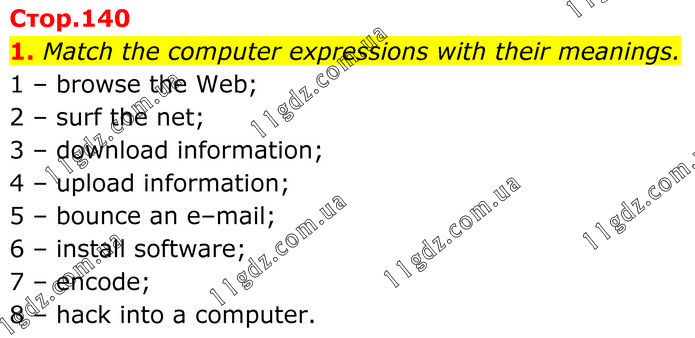 Match the computer expressions with their meanings. 1 – browse the Web; 2 – surf the net; 3 – download information; 4 – upload information; 5 – bounce an e–mail; 6 – install software; 7 – encode; 8 – hack into a computer.