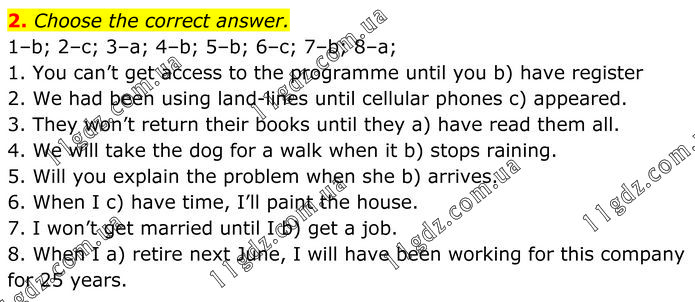 Choose the correct answer. 1–b; 2–c; 3–a; 4–b; 5–b; 6–c; 7–b; 8–a; 1. You can’t get access to the programme until you b) have register 2. We had been using land-lines until cellular phones c) appeared. 3. They won’t return their books until they a) have read them all. 4. We will take the dog for a walk when it b) stops raining. 5. Will you explain the problem when she b) arrives. 6. When I c) have time, I’ll paint the house. 7. I won’t get married until I b) get a job. 8. When I a) retire next June, I will have been working for this company for 25 years.
