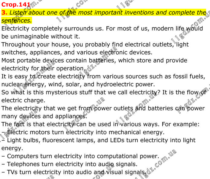Listen about one of the most important inventions and complete the sentences. Electricity completely surrounds us. For most of us, modern life would be unimaginable without it. Throughout your house, you probably find electrical outlets, light switches, appliances, and various electronic devices. Most portable devices contain batteries, which store and provide electricity for their operation. It is easy to create electricity from various sources such as fossil fuels, nuclear energy, wind, solar, and hydroelectric power. So what is this mysterious stuff that we call electricity? It is the flow of electric charge. The electricity that we get from power outlets and batteries can power many devices and appliances. The fact is that electricity can be used in various ways. For example: – Electric motors turn electricity into mechanical energy. – Light bulbs, fluorescent lamps, and LEDs turn electricity into light energy. – Computers turn electricity into computational power. – Telephones turn electricity into audio signals. – TVs turn electricity into audio and visual signals.
