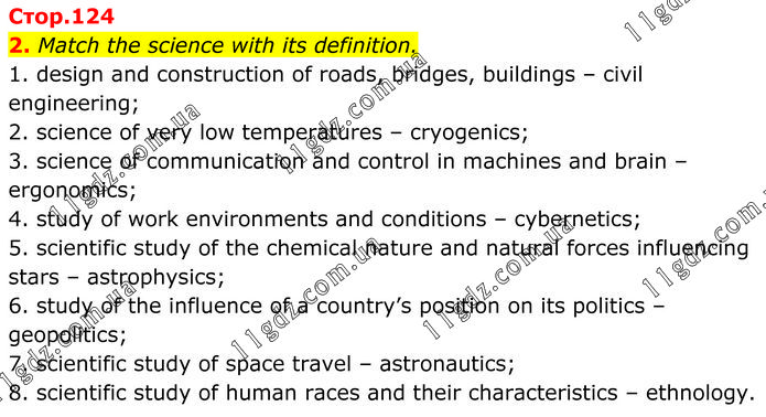 Match the science with its definition. 1. design and construction of roads, bridges, buildings – civil engineering; 2. science of very low temperatures – cryogenics; 3. science of communication and control in machines and brain – ergonomics; 4. study of work environments and conditions – cybernetics; 5. scientific study of the chemical nature and natural forces influencing stars – astrophysics; 6. study of the influence of a country’s position on its politics – geopolitics; 7. scientific study of space travel – astronautics; 8. scientific study of human races and their characteristics – ethnology.