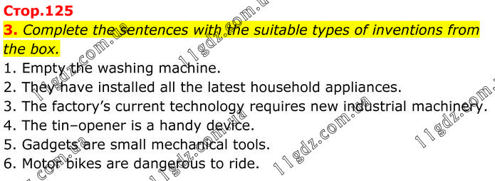 Complete the sentences with the suitable types of inventions from the box. 1. Empty the washing machine. 2. They have installed all the latest household appliances. 3. The factory’s current technology requires new industrial machinery. 4. The tin–opener is a handy device. 5. Gadgets are small mechanical tools. 6. Motor bikes are dangerous to ride.