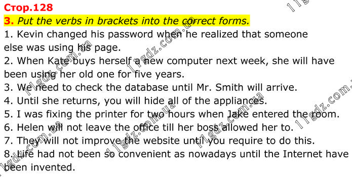 Put the verbs in brackets into the correct forms. 1. Kevin changed his password when he realized that someone else was using his page. 2. When Kate buys herself a new computer next week, she will have been using her old one for five years. 3. We need to check the database until Mr. Smith will arrive. 4. Until she returns, you will hide all of the appliances. 5. I was fixing the printer for two hours when Jake entered the room. 6. Helen will not leave the office till her boss allowed her to. 7. They will not improve the website until you require to do this. 8. Life had not been so convenient as nowadays until the Internet have been invented.