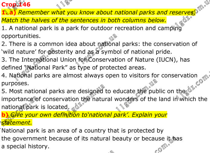 a) Remember what you know about national parks and reserves. Match the halves of the sentences in both columns below. 1. A national park is a park for outdoor recreation and camping opportunities. 2. There is a common idea about national parks: the conservation of ‘wild nature’ for posterity and as a symbol of national pride. 3. The International Union for Conservation of Nature (IUCN), has defined “National Park” as type of protected areas. 4. National parks are almost always open to visitors for conservation purposes. 5. Most national parks are designed to educate the public on the importance of conservation the natural wonders of the land in which the national park is located. b) Give your own definition to‘national park’. Explain your statement. National park is an area of a country that is protected by the government because of its natural beauty or because it has a special history.