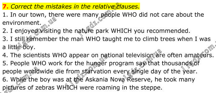 Correct the mistakes in the relative clauses. 1. In our town, there were many people WHO did not care about the environment. 2. I enjoyed visiting the nature park WHICH you recommended. 3. I still remember the man WHO taught me to climb trees when I was a little boy. 4. The scientists WHO appear on national television are often amateurs. 5. People WHO work for the hunger program say that thousands of people worldwide die from starvation every single day of the year. 6. While the boy was at the Askania Nova Reserve, he took many pictures of zebras WHICH were roaming in the steppe.