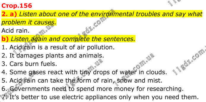 a) Listen about one of the environmental troubles and say what problem it causes. Acid rain. b) Listen again and complete the sentences. 1. Acid rain is a result of air pollution. 2. It damages plants and animals. 3. Cars burn fuels. 4. Some gases react with tiny drops of water in clouds. 5. Acid rain can take the form of rain, snow and mist. 6. Governments need to spend more money for researching. 7. It’s better to use electric appliances only when you need them.