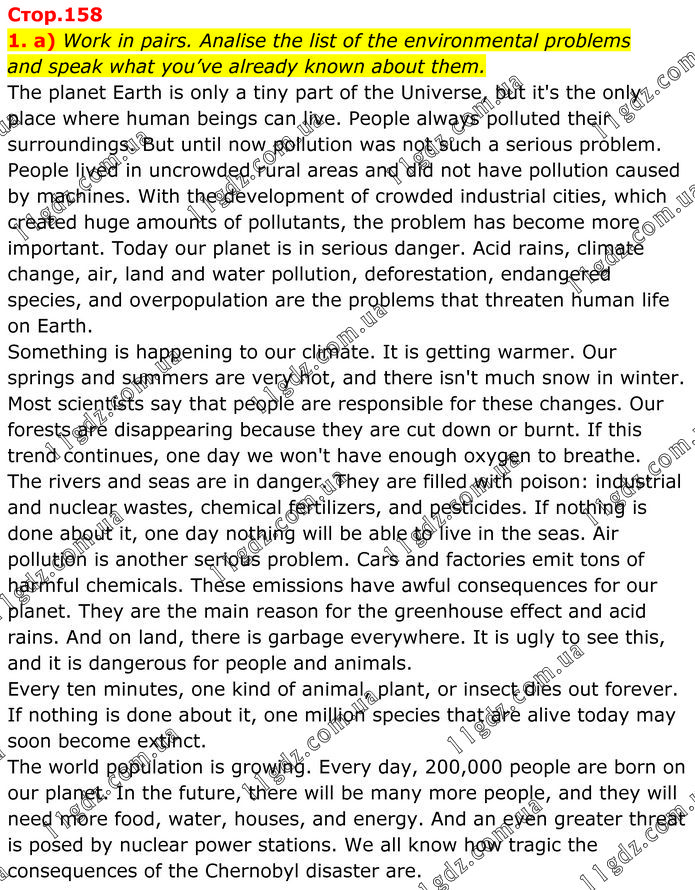 Work in pairs. Analise the list of the environmental problems and speak what you’ve already known about them. The planet Earth is only a tiny part of the Universe, but it's the only place where human beings can live. People always polluted their surroundings. But until now pollution was not such a serious problem. People lived in uncrowded rural areas and did not have pollution caused by machines. With the development of crowded industrial cities, which created huge amounts of pollutants, the problem has become more important. Today our planet is in serious danger. Acid rains, climate change, air, land and water pollution, deforestation, endangered species, and overpopulation are the problems that threaten human life on Earth. Something is happening to our climate. It is getting warmer. Our springs and summers are very hot, and there isn't much snow in winter. Most scientists say that people are responsible for these changes. Our forests are disappearing because they are cut down or burnt. If this trend continues, one day we won't have enough oxygen to breathe. The rivers and seas are in danger. They are filled with poison: industrial and nuclear wastes, chemical fertilizers, and pesticides. If nothing is done about it, one day nothing will be able to live in the seas. Air pollution is another serious problem. Cars and factories emit tons of harmful chemicals. These emissions have awful consequences for our planet. They are the main reason for the greenhouse effect and acid rains. And on land, there is garbage everywhere. It is ugly to see this, and it is dangerous for people and animals. Every ten minutes, one kind of animal, plant, or insect dies out forever. If nothing is done about it, one million species that are alive today may soon become extinct. The world population is growing. Every day, 200,000 people are born on our planet. In the future, there will be many more people, and they will need more food, water, houses, and energy. And an even greater threat is posed by nuclear power stations. We all know how tragic the consequences of the Chernobyl disaster are.