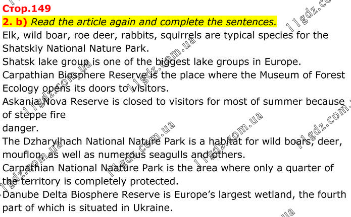 Read the article again and complete the sentences. Elk, wild boar, roe deer, rabbits, squirrels are typical species for the Shatskiy National Nature Park. Shatsk lake group is one of the biggest lake groups in Europe. Carpathian Biosphere Reserve is the place where the Museum of Forest Ecology opens its doors to visitors. Askania Nova Reserve is closed to visitors for most of summer because of steppe fire danger. The Dzharylhach National Nature Park is a habitat for wild boars, deer, mouflon, as well as numerous seagulls and others. Carpathian National Naature Park is the area where only a quarter of the territory is completely protected. Danube Delta Biosphere Reserve is Europe’s largest wetland, the fourth part of which is situated in Ukraine.