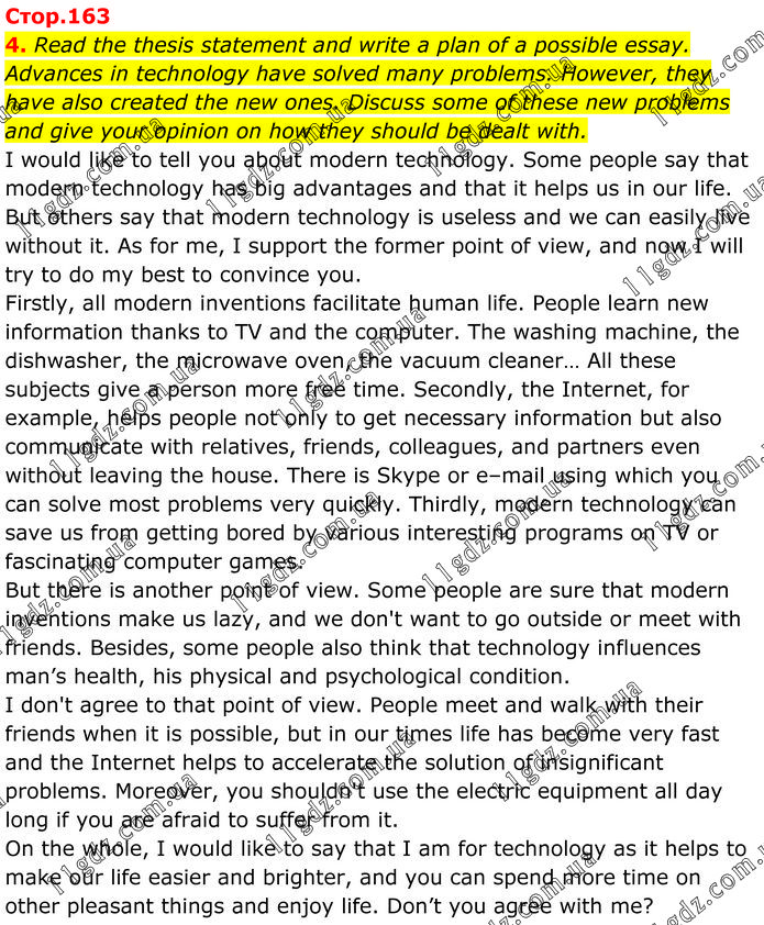 Read the thesis statement and write a plan of a possible essay. Advances in technology have solved many problems. However, they have also created the new ones. Discuss some of these new problems and give your opinion on how they should be dealt with. I would like to tell you about modern technology. Some people say that modern technology has big advantages and that it helps us in our life. But others say that modern technology is useless and we can easily live without it. As for me, I support the former point of view, and now I will try to do my best to convince you. Firstly, all modern inventions facilitate human life. People learn new information thanks to TV and the computer. The washing machine, the dishwasher, the microwave oven, the vacuum cleaner… All these subjects give a person more free time. Secondly, the Internet, for example, helps people not only to get necessary information but also communicate with relatives, friends, colleagues, and partners even without leaving the house. There is Skype or e–mail using which you can solve most problems very quickly. Thirdly, modern technology can save us from getting bored by various interesting programs on TV or fascinating computer games. But there is another point of view. Some people are sure that modern inventions make us lazy, and we don't want to go outside or meet with friends. Besides, some people also think that technology influences man’s health, his physical and psychological condition. I don't agree to that point of view. People meet and walk with their friends when it is possible, but in our times life has become very fast and the Internet helps to accelerate the solution of insignificant problems. Moreover, you shouldn't use the electric equipment all day long if you are afraid to suffer from it. On the whole, I would like to say that I am for technology as it helps to make our life easier and brighter, and you can spend more time on other pleasant things and enjoy life. Don’t you agree with me?