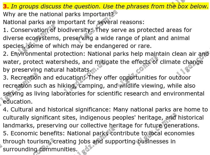 In groups discuss the question. Use the phrases from the box below. Why are the national parks important? National parks are important for several reasons: 1. Conservation of biodiversity: They serve as protected areas for diverse ecosystems, preserving a wide range of plant and animal species, some of which may be endangered or rare. 2. Environmental protection: National parks help maintain clean air and water, protect watersheds, and mitigate the effects of climate change by preserving natural habitats. 3. Recreation and education: They offer opportunities for outdoor recreation such as hiking, camping, and wildlife viewing, while also serving as living laboratories for scientific research and environmental education. 4. Cultural and historical significance: Many national parks are home to culturally significant sites, indigenous peoples' heritage, and historical landmarks, preserving our collective heritage for future generations. 5. Economic benefits: National parks contribute to local economies through tourism, creating jobs and supporting businesses in surrounding communities.