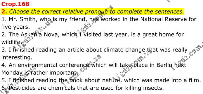 Choose the correct relative pronoun to complete the sentences. 1. Mr. Smith, who is my friend, has worked in the National Reserve for five years. 2. The Askania Nova, which I visited last year, is a great home for wildlife. 3. I finished reading an article about climate change that was really interesting. 4. An environmental conference which will take place in Berlin next Monday is rather important. 5. I finished reading the book about nature, which was made into a film. 6. Pesticides are chemicals that are used for killing insects.