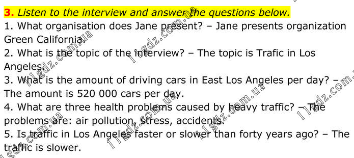 Listen to the interview and answer the questions below. 1. What organisation does Jane present? – Jane presents organization Green California. 2. What is the topic of the interview? – The topic is Trafic in Los Angeles. 3. What is the amount of driving cars in East Los Angeles per day? – The amount is 520 000 cars per day. 4. What are three health problems caused by heavy traffic? – The problems are: air pollution, stress, accidents. 5. Is traffic in Los Angeles faster or slower than forty years ago? – The traffic is slower.
