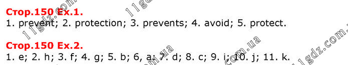 Стор.150 Ex.1. 1. prevent; 2. protection; 3. prevents; 4. avoid; 5. protect. Стор.150 Ex.2. 1. e; 2. h; 3. f; 4. g; 5. b; 6, a: 7. d; 8. c; 9. i; 10. j; 11. k.