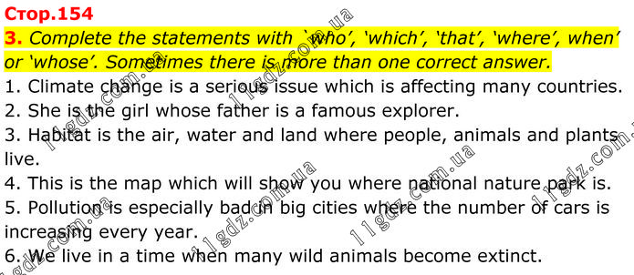 Complete the statements with `who’, ‘which’, ‘that’, ‘where’, when’ or ‘whose’. Sometimes there is more than one correct answer. 1. Climate change is a serious issue which is affecting many countries. 2. She is the girl whose father is a famous explorer. 3. Habitat is the air, water and land where people, animals and plants live. 4. This is the map which will show you where national nature park is. 5. Pollution is especially bad in big cities where the number of cars is increasing every year. 6. We live in a time when many wild animals become extinct.