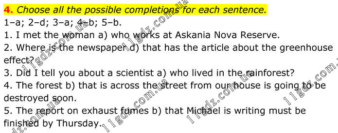 Choose all the possible completions for each sentence. 1–a; 2–d; 3–a; 4–b; 5–b. 1. I met the woman a) who works at Askania Nova Reserve. 2. Where is the newspaper d) that has the article about the greenhouse effect? 3. Did I tell you about a scientist a) who lived in the rainforest? 4. The forest b) that is across the street from our house is going to be destroyed soon. 5. The report on exhaust fumes b) that Michael is writing must be finished by Thursday.