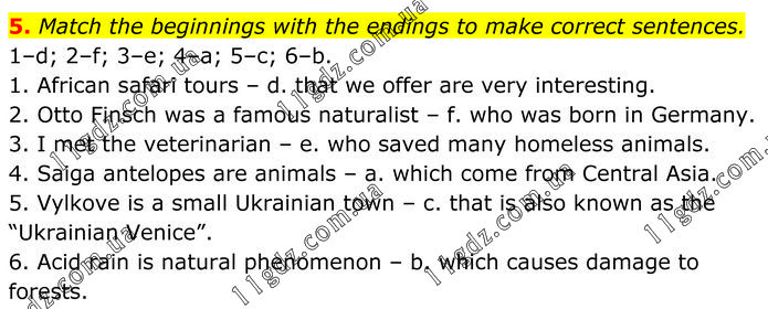 Match the beginnings with the endings to make correct sentences. 1–d; 2–f; 3–e; 4–a; 5–c; 6–b. 1. African safari tours – d. that we offer are very interesting. 2. Otto Finsch was a famous naturalist – f. who was born in Germany. 3. I met the veterinarian – e. who saved many homeless animals. 4. Saiga antelopes are animals – a. which come from Central Asia. 5. Vylkove is a small Ukrainian town – c. that is also known as the “Ukrainian Venice”. 6. Acid rain is natural phenomenon – b. which causes damage to forests.