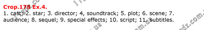 1. cast; 2. star; 3. director; 4, soundtrack; 5. plot; 6. scene; 7. audience; 8. sequel; 9. special effects; 10. script; 11. subtitles.