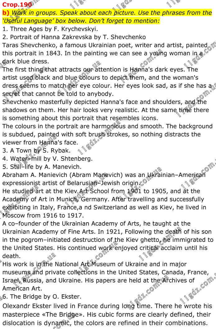 Work in groups. Speak about each picture. Use the phrases from the ‘Useful Language’ box below. Don’t forget to mention: 1. Three Ages by F. Krychevskyi. 2. Portrait of Hanna Zakrevska by T. Shevchenko Taras Shevchenko, a famous Ukrainian poet, writer and artist, painted this portrait in 1843. In the painting we can see a young woman in a dark blue dress. The first thing that attracts our attention is Hanna's dark eyes. The artist used black and blue colours to depict them, and the woman's dress seems to match her eye colour. Her eyes look sad, as if she has a secret that cannot be told to anybody. Shevchenko masterfully depicted Hanna's face and shoulders, and the shadows on them. Her hair looks very realistic. At the same time there is something about this portrait that resembles icons. The colours in the portrait are harmonious and smooth. The background is subdued, painted with soft brush strokes, so nothing distracts the viewer from Hanna's face. 3. A Town by S. Rybak. 4. Water–mill by V. Shtenberg. 5. Still–life by A. Manevich. Abraham A. Manievich (Abram Manevich) was an Ukrainian–American expressionist artist of Belarusian–Jewish origin. He studied art at the Kiev Art School from 1901 to 1905, and at the Academy of Art in Munich, Germany. After travelling and successfully exhibiting in Italy, France,a nd Switzerland as well as Kiev, he lived in Moscow from 1916 to 1917. A co–founder of the Ukrainian Academy of Arts, he taught at the Ukrainian Academy of Fine Arts. In 1921, Following the death of his son in the pogrom–initiated destruction of the Kiev ghetto, he immigrated to the United States. His continued work enjoyed critical acclaim until his death. His work is in the National Art Museum of Ukraine and in major museums and private collections in the United States, Canada, France, Israel, Russia, and Ukraine. His papers are held at the Archives of American Art. 6. The Bridge by O. Ekster. Olexandr Ekster lived in France during long time. There he wrote his masterpiece «The Bridge». His cubic forms are clearly defined, their dislocation is dynamic, the colors are refined in their combinations.