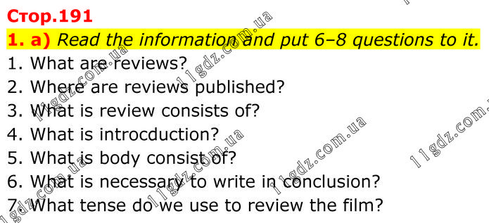 Read the information and put 6–8 questions to it. 1. What are reviews? 2. Where are reviews published? 3. What is review consists of? 4. What is introcduction? 5. What is body consist of? 6. What is necessary to write in conclusion? 7. What tense do we use to review the film?