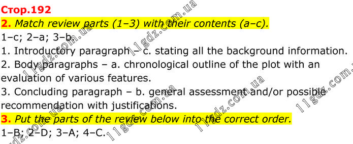 2. Match review parts (1–3) with their contents (а–с). 1–с; 2–a; 3–b. 1. Introductory paragraph – c. stating all the background information. 2. Body paragraphs – a. chronological outline of the plot with an evaluation of various features. 3. Concluding paragraph – b. general assessment and/or possible recommendation with justifications. 3. Put the parts of the review below into the correct order. 1–B; 2–D; 3–A; 4–C.