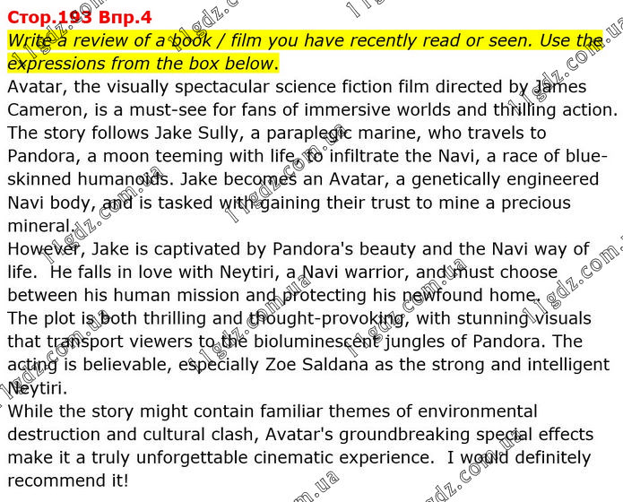 Write a review of a book / film you have recently read or seen. Use the expressions from the box below. Avatar, the visually spectacular science fiction film directed by James Cameron, is a must-see for fans of immersive worlds and thrilling action. The story follows Jake Sully, a paraplegic marine, who travels to Pandora, a moon teeming with life, to infiltrate the Navi, a race of blue-skinned humanoids. Jake becomes an Avatar, a genetically engineered Navi body, and is tasked with gaining their trust to mine a precious mineral. However, Jake is captivated by Pandora's beauty and the Navi way of life. He falls in love with Neytiri, a Navi warrior, and must choose between his human mission and protecting his newfound home. The plot is both thrilling and thought-provoking, with stunning visuals that transport viewers to the bioluminescent jungles of Pandora. The acting is believable, especially Zoe Saldana as the strong and intelligent Neytiri. While the story might contain familiar themes of environmental destruction and cultural clash, Avatar's groundbreaking special effects make it a truly unforgettable cinematic experience. I would definitely recommend it!