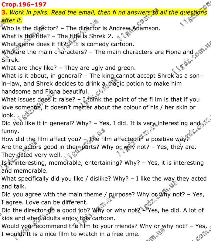 Work in pairs. Read the email, then fi nd answers to all the questions after it. Who is the director? – The director is Andrew Adamson. What is the title? – The title is Shrek 2. What genre does it fit? – It is comedy cartoon. Who are the main characters? – The main characters are Fiona and Shrek. What are they like? – They are ugly and green. What is it about, in general? – The king cannot accept Shrek as a son–in–law, and Shrek decides to drink a magic potion to make him handsome and Fiona beautiful. What issues does it raise? – I think the point of the fi lm is that if you love someone, it doesn’t matter about the colour of his / her skin or look. Did you like it in general? Why? – Yes, I did. It is very interesting and funny. How did the film affect you? – The film affected in a positive way. Are the actors good in their parts? Why or why not? – Yes, they are. They acted very well. Is it interesting, memorable, entertaining? Why? – Yes, it is interesting and memorable. What specifically did you like / dislike? Why? – I like the way they acted and talk. Did you agree with the main theme / purpose? Why or why not? – Yes, I agree. Love can be different. Did the director do a good job? Why or why not? – Yes, he did. A lot of kids and eben adults enjoy this cartoon. Would you recommend the film to your friends? Why or why not? – Yes, I would. It is a nice film to wtatch in a free time.