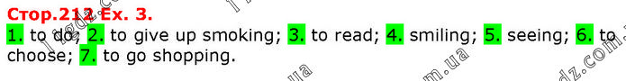 1. to do; 2. to give up smoking; 3. to read; 4. smiling; 5. seeing; 6. to choose; 7. to go shopping.