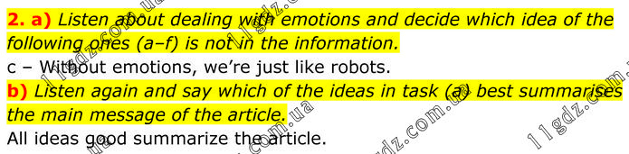 a) Listen about dealing with emotions and decide which idea of the following ones (a–f) is not in the information. c – Without emotions, we’re just like robots. b) Listen again and say which of the ideas in task (a) best summarises the main message of the article. All ideas good summarize the article.