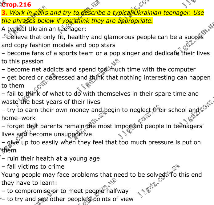 Work in pairs and try to describe a typical Ukrainian teenager. Use the phrases below if you think they are appropriate. A typical Ukrainian teenager: – believe that only fit, healthy and glamorous people can be a succes and copy fashion models and pop stars – become fans of a sports team or a pop singer and dedicate their lives to this passion – become net addicts and spend too much time with the computer – get bored or depressed and think that nothing interesting can happen to them – fail to think of what to do with themselves in their spare time and waste the best years of their lives – try to earn their own money and begin to neglect their school and home–work – forget that parents remain the most important people in teenagers' lives and become unsupportive – give up too easily when they feel that too much pressure is put on them – ruin their health at a young age – fall victims to crime Young people may face problems that need to be solved. To this end they have to learn: – to compromise or to meet people halfway – to try and see other people's points of view