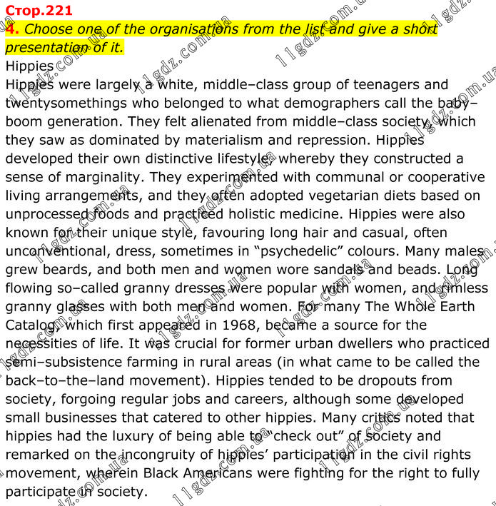 Choose one of the organisations from the list and give a short presentation of it. Hippies Hippies were largely a white, middle–class group of teenagers and twentysomethings who belonged to what demographers call the baby–boom generation. They felt alienated from middle–class society, which they saw as dominated by materialism and repression. Hippies developed their own distinctive lifestyle, whereby they constructed a sense of marginality. They experimented with communal or cooperative living arrangements, and they often adopted vegetarian diets based on unprocessed foods and practiced holistic medicine. Hippies were also known for their unique style, favouring long hair and casual, often unconventional, dress, sometimes in “psychedelic” colours. Many males grew beards, and both men and women wore sandals and beads. Long flowing so–called granny dresses were popular with women, and rimless granny glasses with both men and women. For many The Whole Earth Catalog, which first appeared in 1968, became a source for the necessities of life. It was crucial for former urban dwellers who practiced semi–subsistence farming in rural areas (in what came to be called the back–to–the–land movement). Hippies tended to be dropouts from society, forgoing regular jobs and careers, although some developed small businesses that catered to other hippies. Many critics noted that hippies had the luxury of being able to “check out” of society and remarked on the incongruity of hippies’ participation in the civil rights movement, wherein Black Americans were fighting for the right to fully participate in society.