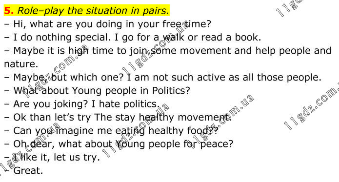 Role–play the situation in pairs. – Hi, what are you doing in your free time? – I do nothing special. I go for a walk or read a book. – Maybe it is high time to join some movement and help people and nature. – Maybe, but which one? I am not such active as all those people. – What about Young people in Politics? – Are you joking? I hate politics. – Ok than let’s try The stay healthy movement. – Can you imagine me eating healthy food?? – Oh dear, what about Young people for peace? – I like it, let us try. – Great.