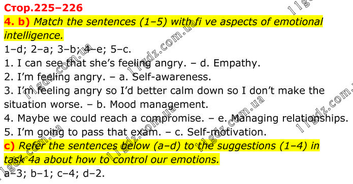 b) Match the sentences (1–5) with fi ve aspects of emotional intelligence. 1–d; 2–a; 3–b; 4–e; 5–c. 1. I can see that she’s feeling angry. – d. Empathy. 2. I’m feeling angry. – a. Self-awareness. 3. I’m feeling angry so I’d better calm down so I don’t make the situation worse. – b. Mood management. 4. Maybe we could reach a compromise. – e. Managing relationships. 5. I’m going to pass that exam. – c. Self-motivation. c) Refer the sentences below (a–d) to the suggestions (1–4) in task 4a about how to control our emotions. a–3; b–1; c–4; d–2.