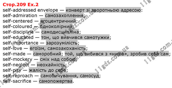 self-addressed envelope — конверт зі зворотньою адресою: self-admiration — самозахоплення; self-centered — егоцентричний; self-coloured — одноколірний; self-discipline — самодисципліна; self-educated — тон, що вивчився самотужки; self-importance — зарозумілість; self-love — егоїзм, самозакоханість; self-made — саморобний; той, що вибився з «низів», зробив себе сам; self-mockery — сміх над собою; self-neglect — неохайність; self-pity — жалість до себе; self-reproach — самобичування, самосуд; self-sacrifice — самопожертва.