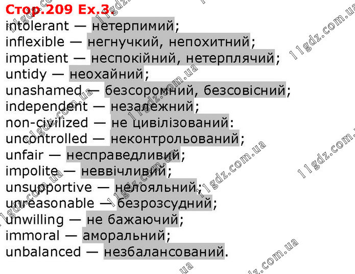 intolerant — нетерпимий; inflexible — негнучкий, непохитний; impatient — неспокійний, нетерплячий; untidy — неохайний; unashamed — безсоромний, безсовісний; independent — незалежний; non-civilized — не цивілізований: uncontrolled — неконтрольований; unfair — несправедливий; impolite — неввічливий; unsupportive — нелояльний; unrеаsоnаblе — безрозсудний; unwilling — не бажаючий; immoral — аморальний; unbalanced — незбалансований.